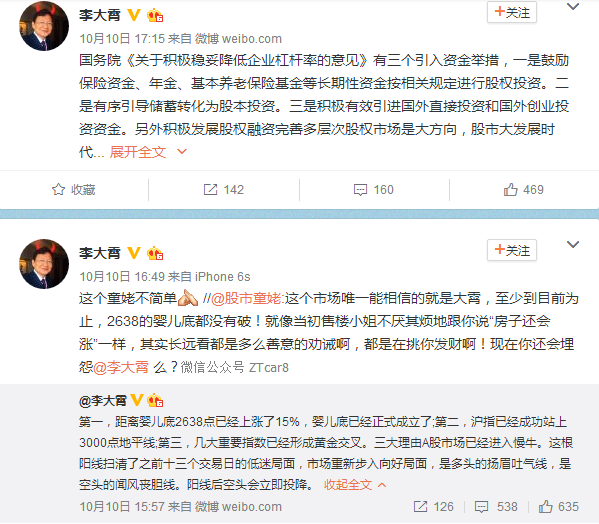 而作为死多头李大霄微博也发布说“国务院《关于积极稳妥降低企业杠杆率的意见》有三个引入资金举措,一是鼓励保险资金、年金、基本养老保险基金等长期性资金按相关规定进行股权投资。二是有序引导储蓄转化为股本投资。三是积极有效引进国外直接投资和国外创业投资资金。另外积极发展股权融资完善多层次股权市场是大方向,股市大发展时代.”
